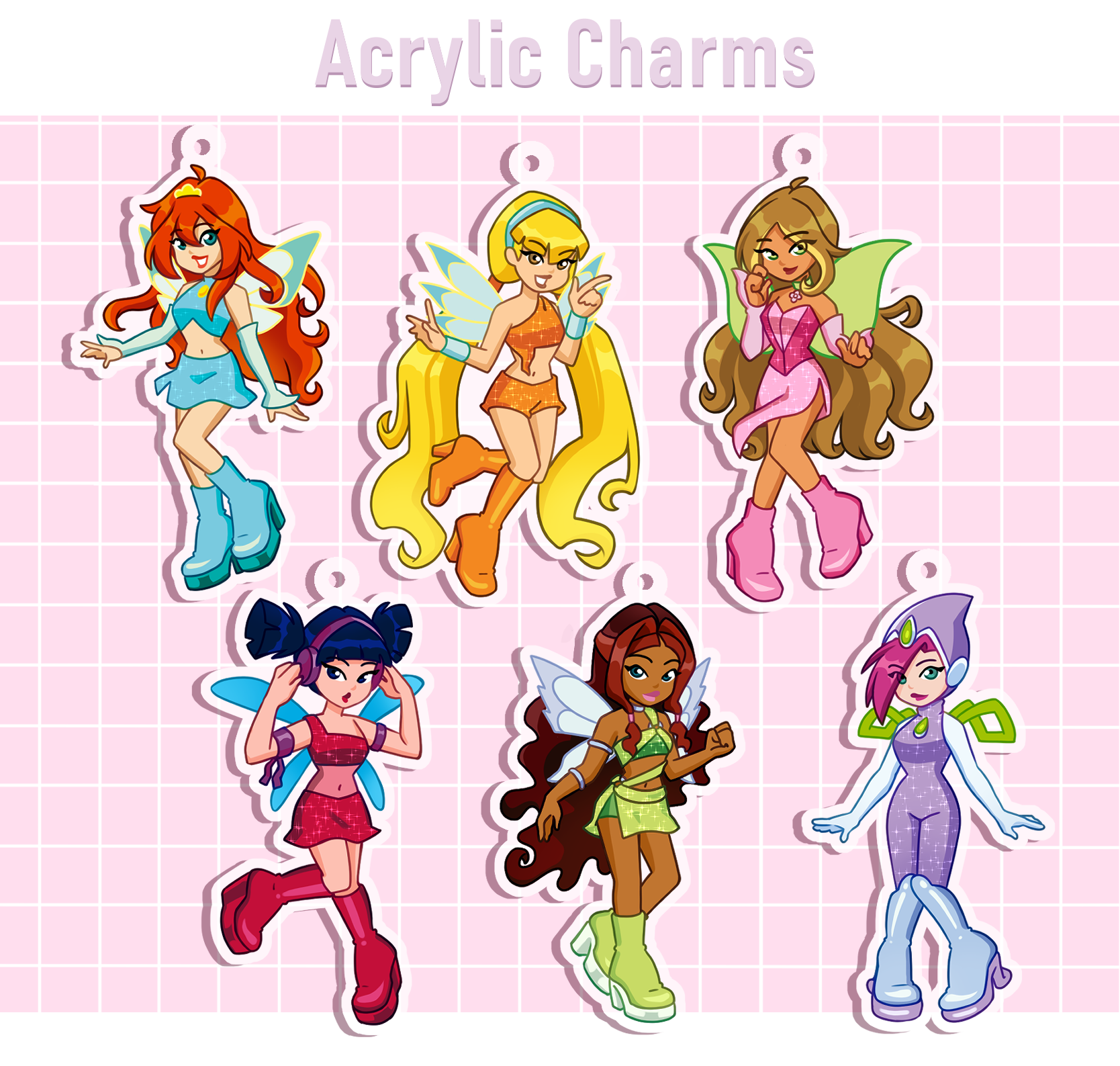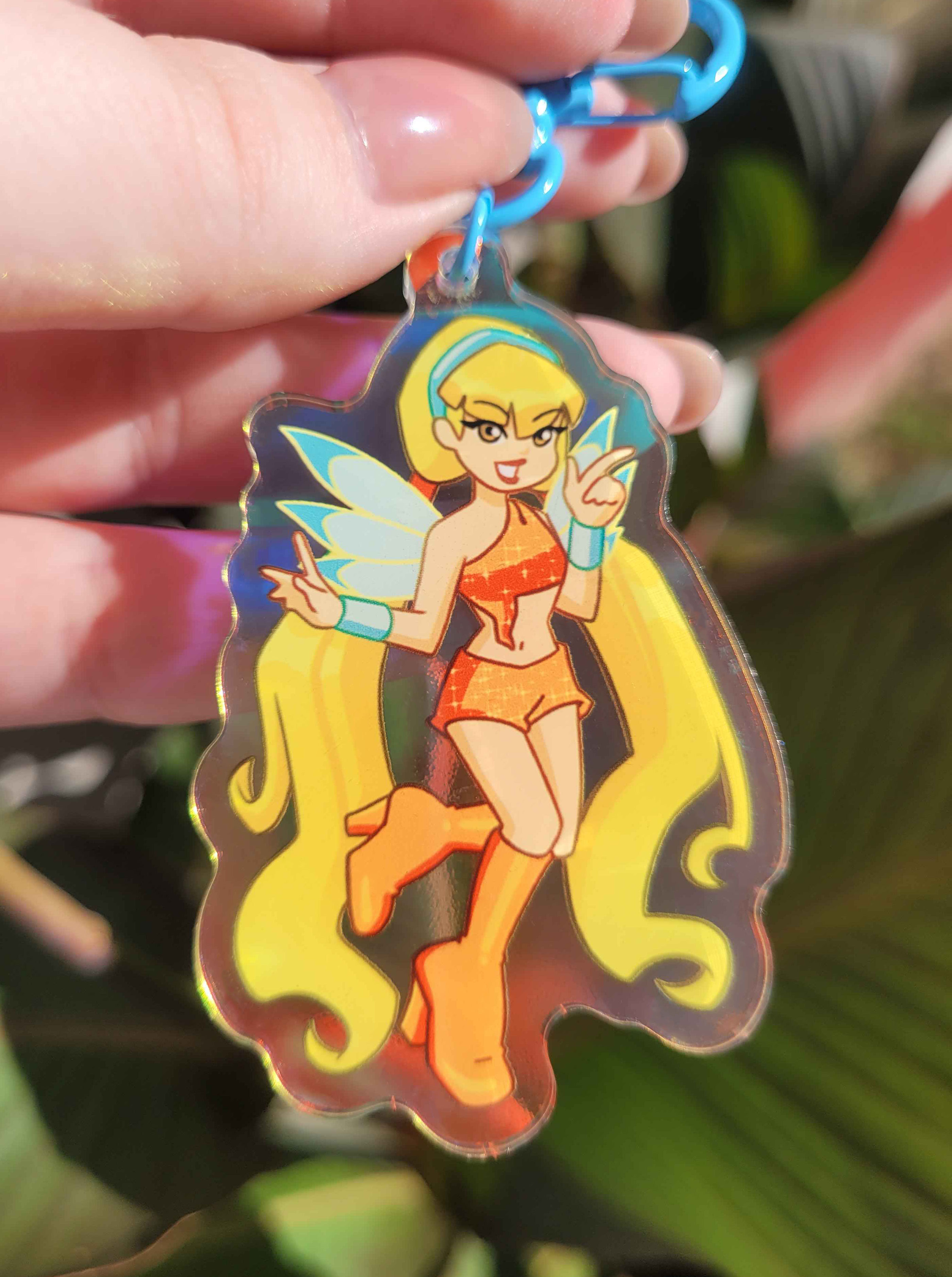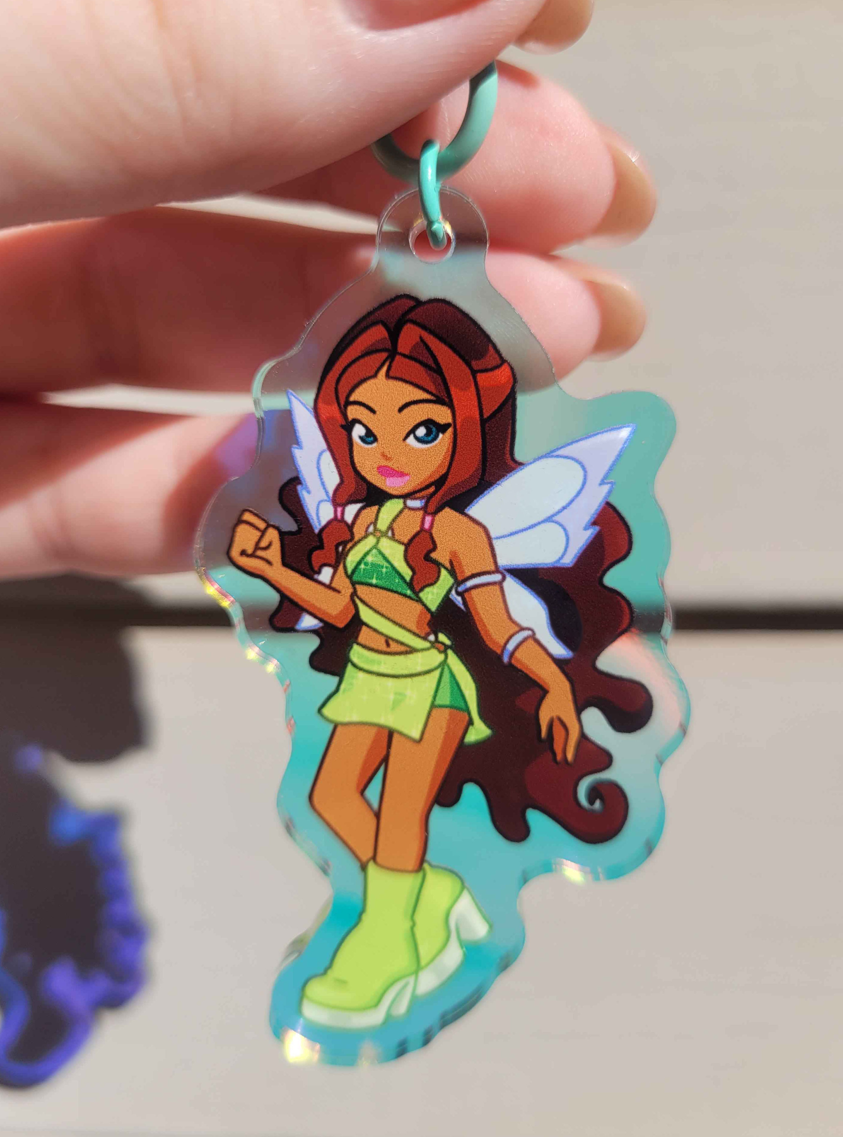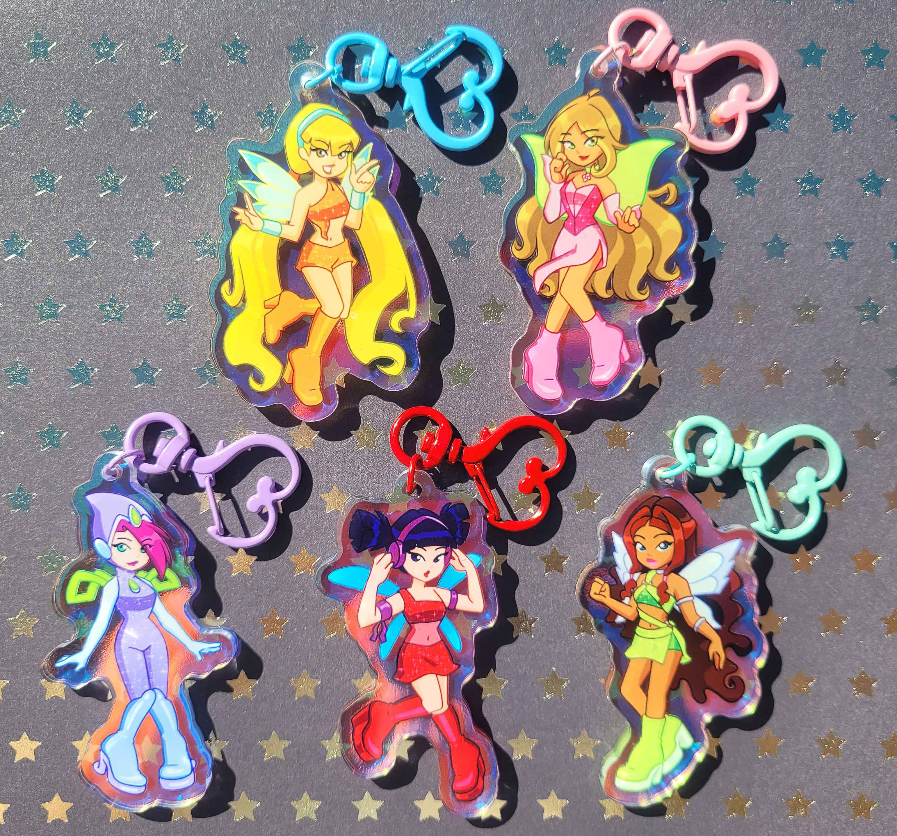 - 2.5in - Double Sided - Holo Acrylic - Colored Heart Clasp - Charms come with a protective film, please peel off!